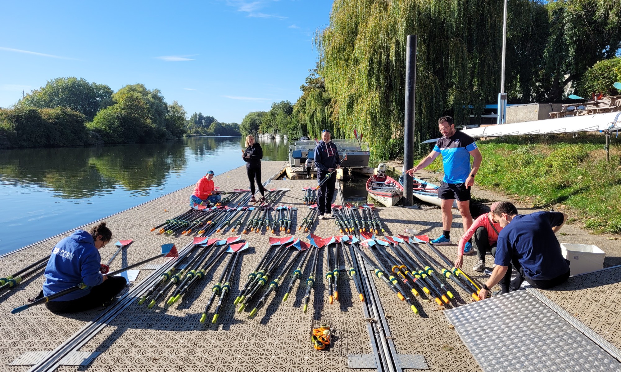 Could there be a better stretch of water to sit beside to re-gear and re-set 70 or so club sculling blades? We don’t think so! Just part of a monumental Club Day at Wallingford RC where senior, master and junior members got together to tidy, clean and organise our boathouse, gym, sculling shed and social rooms. Not an easy task in our Grade II listed 18th century ex-malthouse.