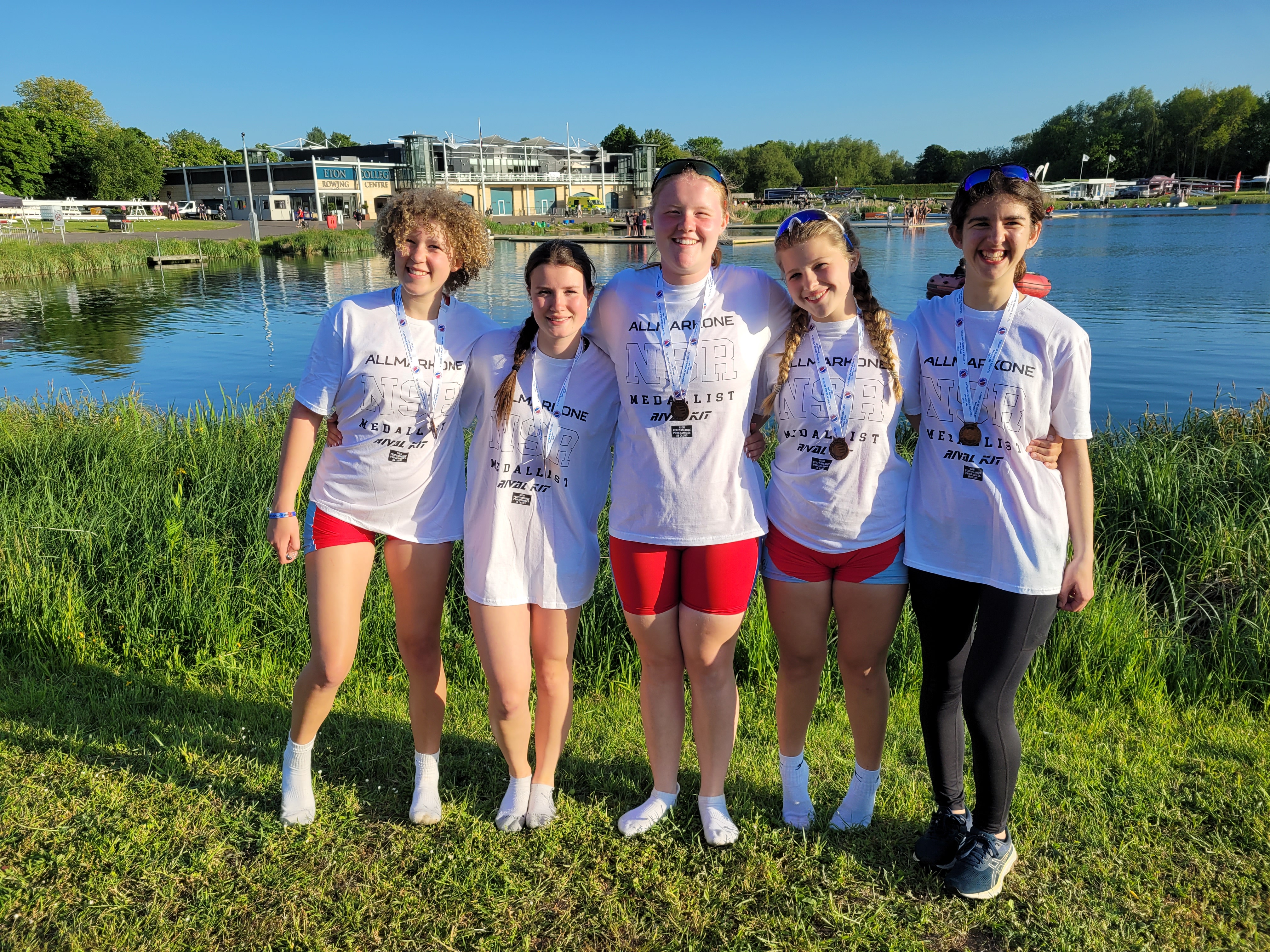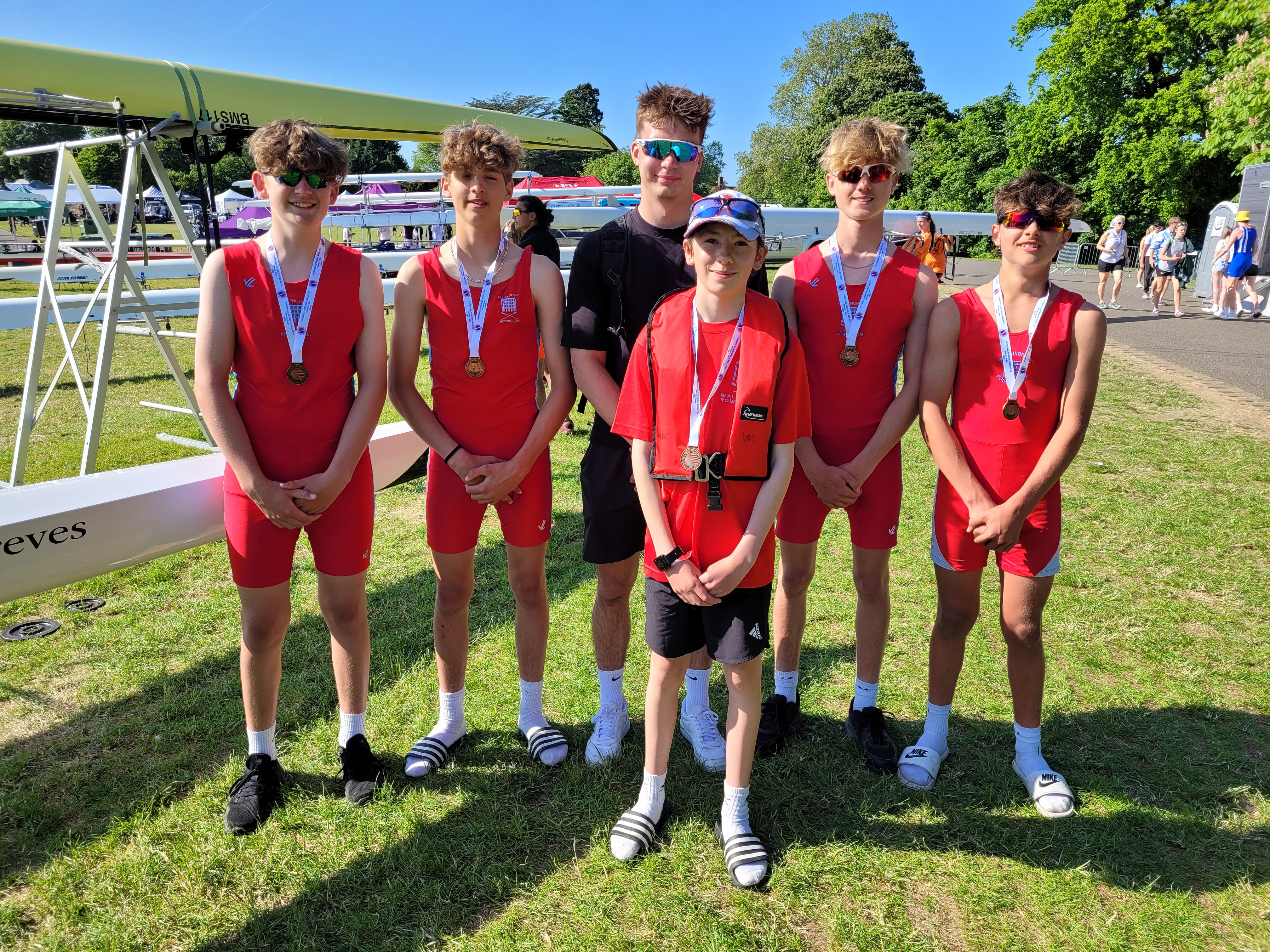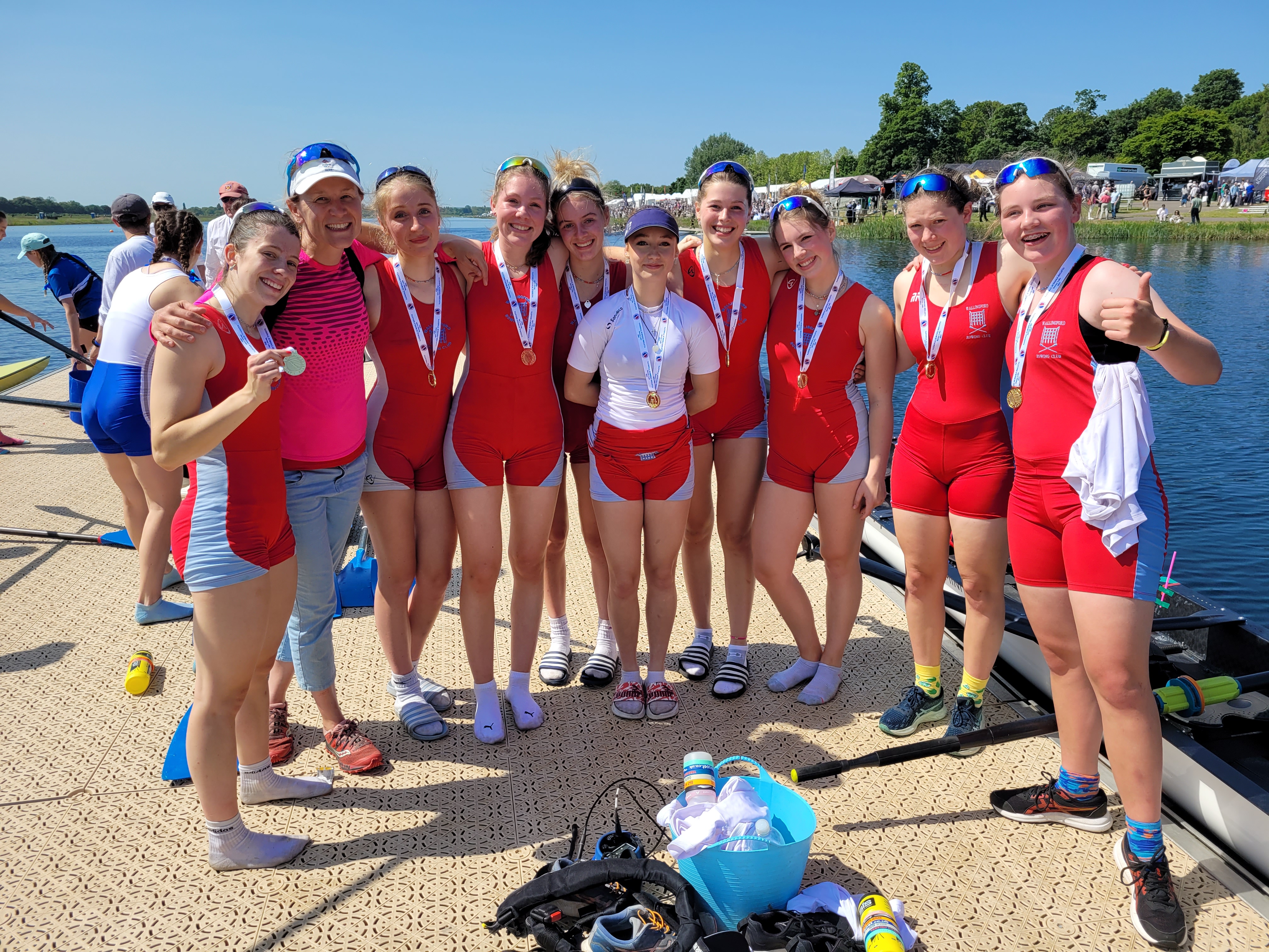 This year’s WJ15 4+ brought home a bronze medal in a particularly tough field, meaning that no fewer than 7 of our WJ15s won a medal, as 3 of the 8+ are also WJ15. The crew of Elsie Warner, Daisy Coleman, Lauren Fiddy, Charlotte Hermsen and cox Nell Peters is all the more remarkable because Daisy only started rowing this year, and Lauren came to us from Reading in January where she had hardly picked up a sweep blade.