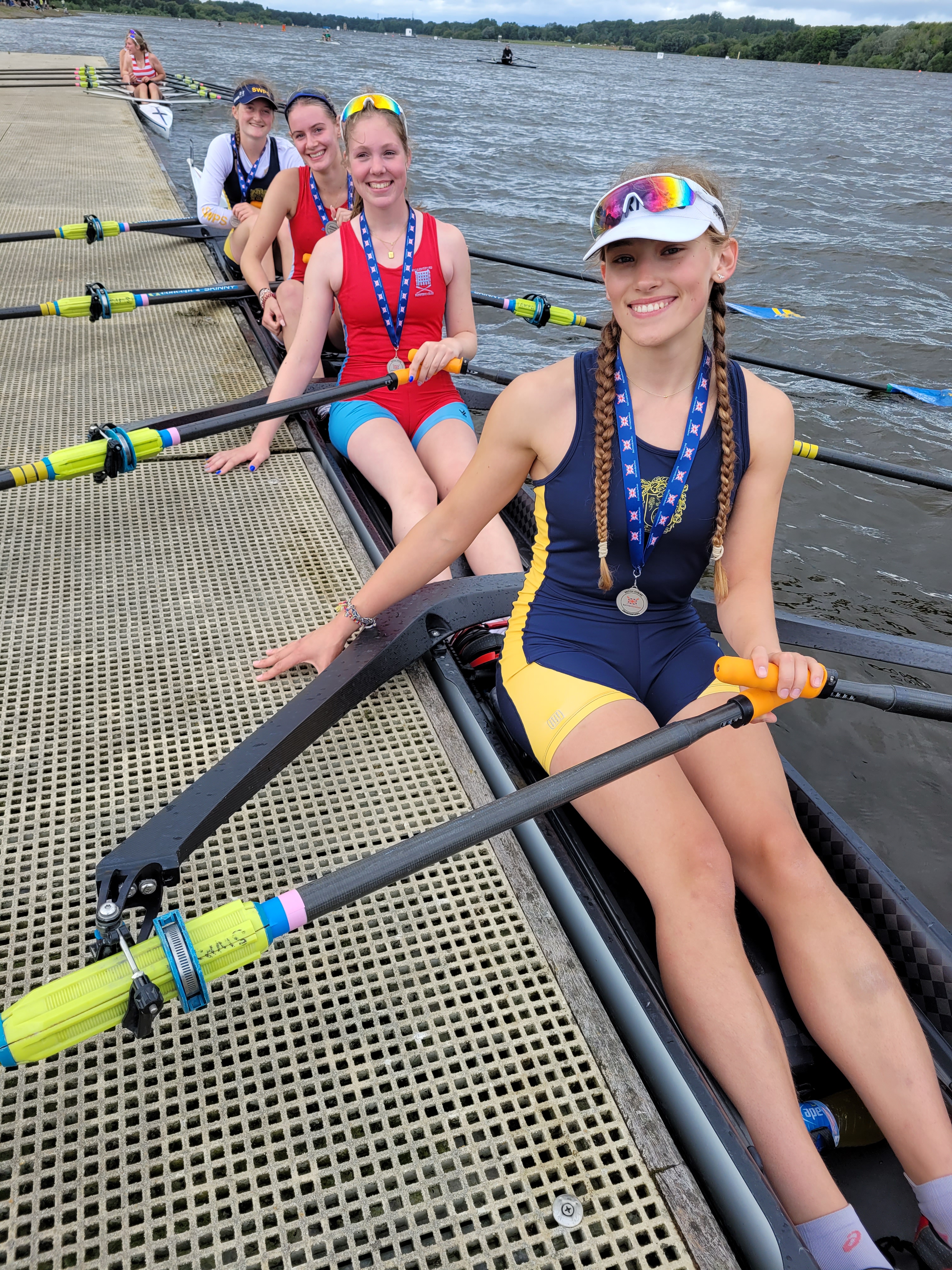 Our WJ16 4+ are now British Champions, adding to their win at Henley Women’s Regatta, although only Tabby Gauden was in both crews. Martha Hudson, Zara Richardson, Lily Clayton and cox Nell Peters proved what amazing strength in depth we have in this squad. Tabby and Zara also picked up a silver medal in a composite WJ16 4x with two girls from Sir William Perkins School, despite trying out another sport on their way to the start (swimming.)
