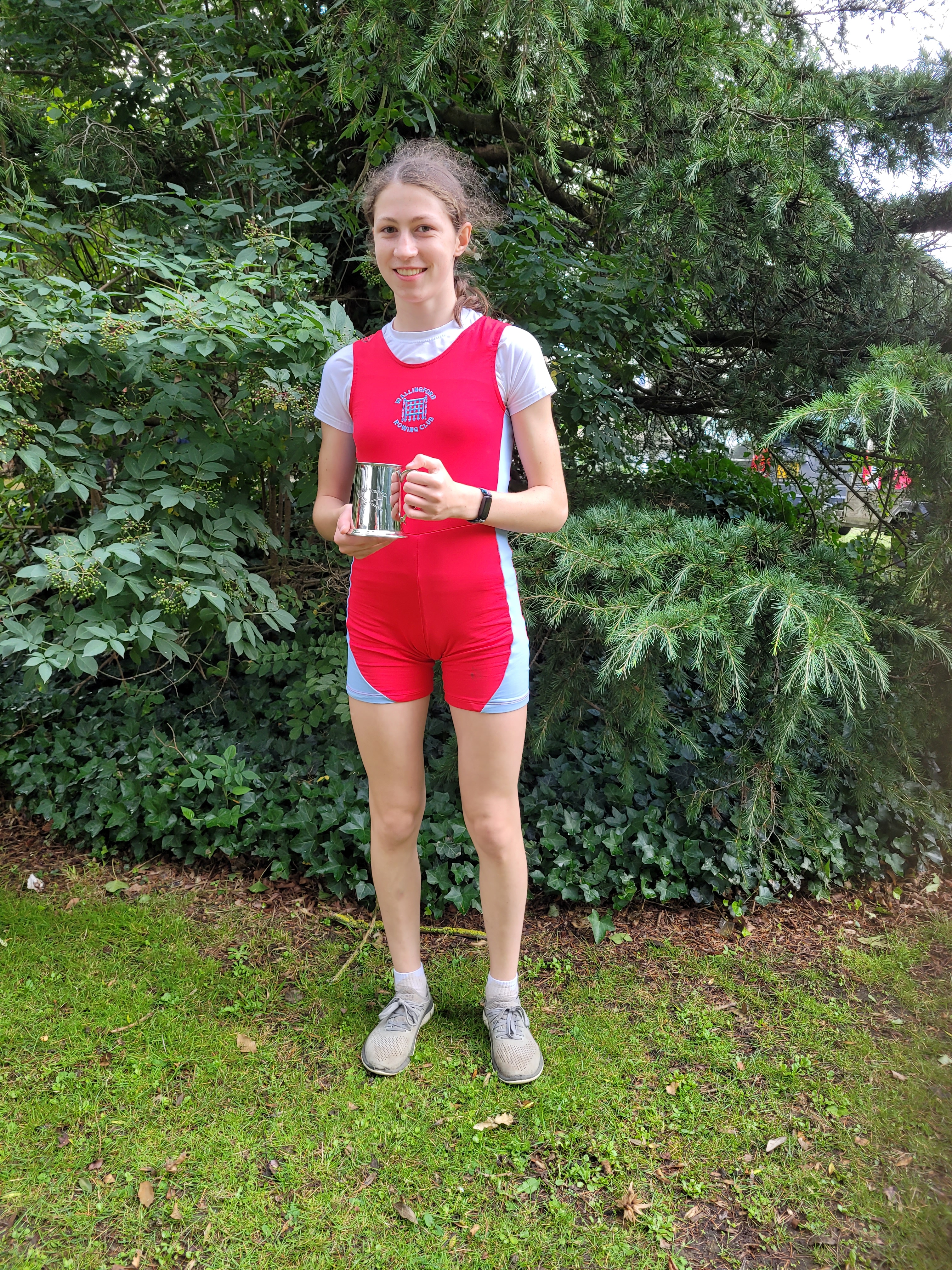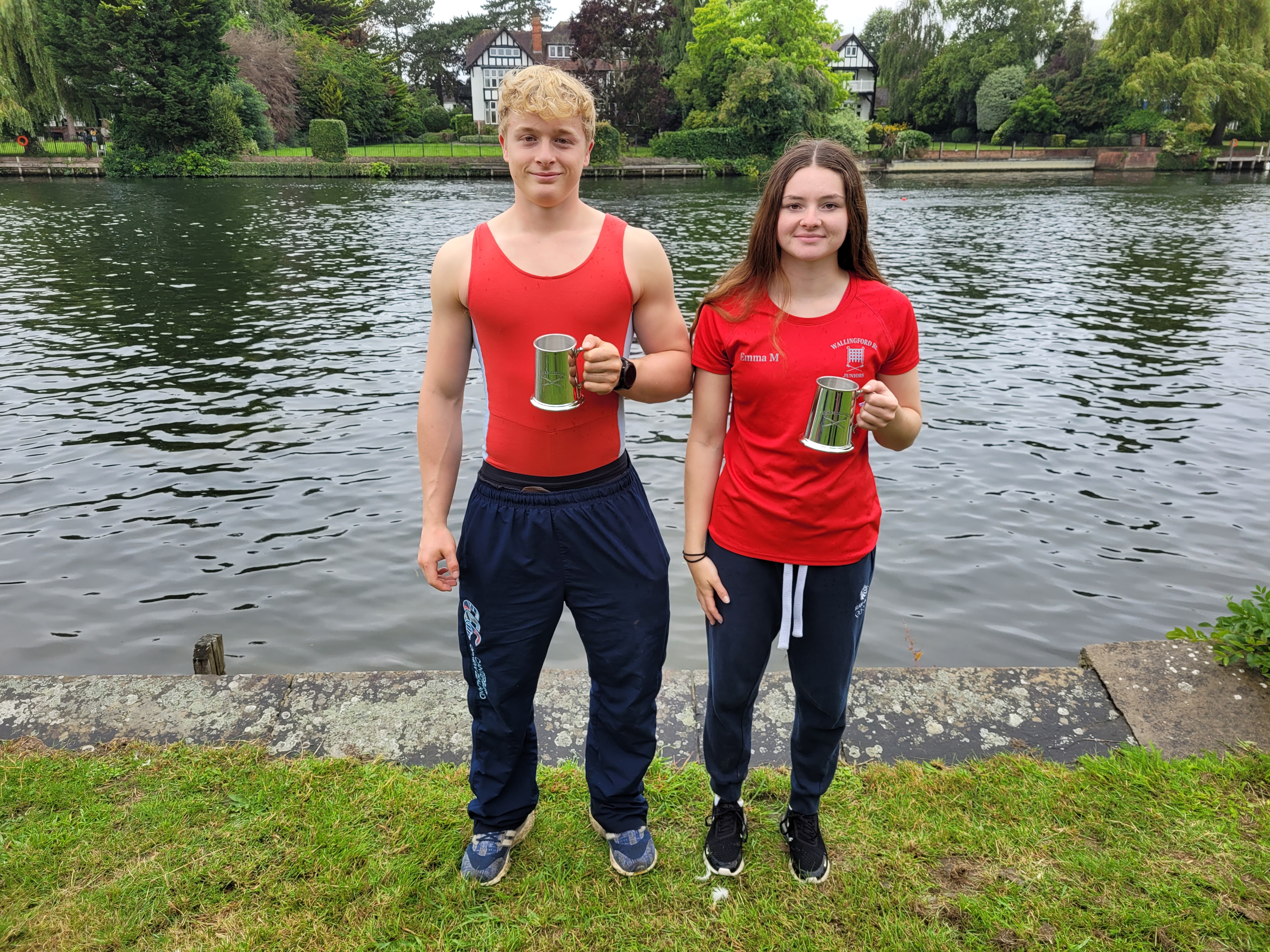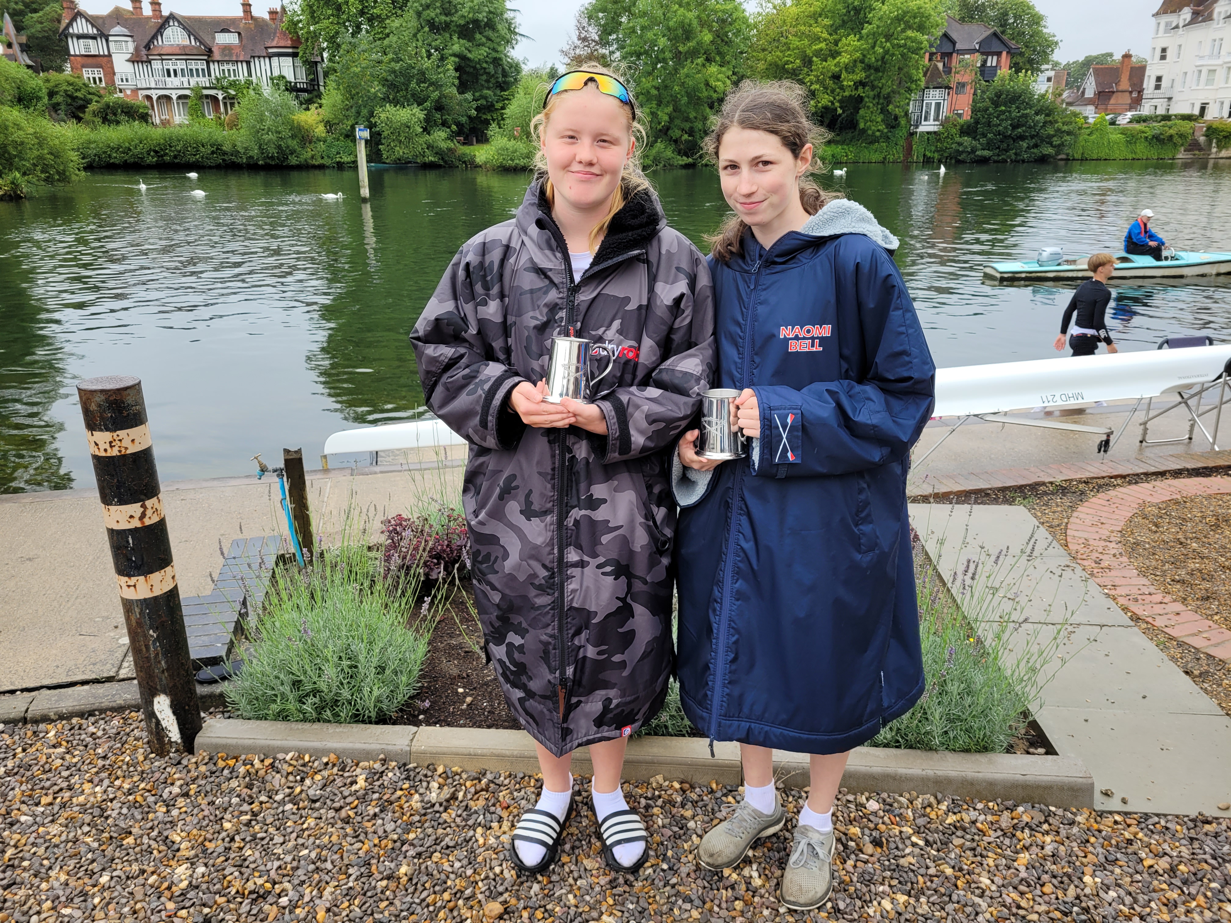 Our Band 1 Mixed 2x of Emma Moroney and Ollie Absolom (Nikki’s son rowing with us over the summer) won the first prize of the day, their adult opponents capsizing dramatically 5 strokes from the finish, but our duo already 1.5 lengths ahead. Michael Bell (also rowing with us for just the summer) won his first ever pot, in J16 1x, quickly followed by his second in J16 2x with Jacob Gunn. His sister Naomi Bell, a full-time member of the Junior squad, won her second consecutive WJ15 1x title after her success at Henley T&V the previous weekend, as well as WJ15 2x with Lauren Fiddy.