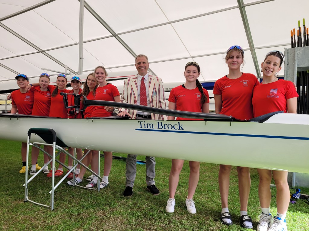 We have named it “Tim Brock” in honour of one of our most cherished members – former Club Captain, current committee member, safety officer, volunteer coach and much more. Here is Tim with the girls of our Prince Philip Challenge Cup crew in the Henley tents.